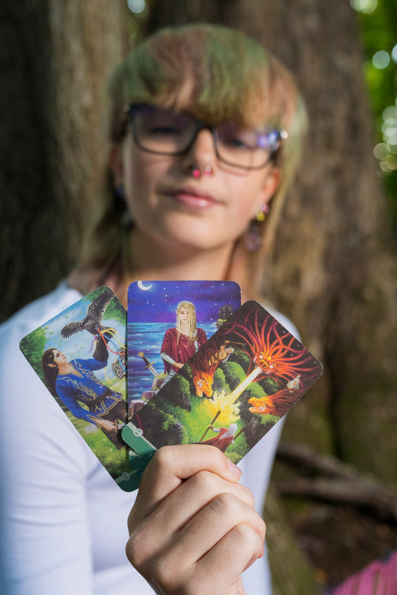 Since Ray has a creative eye and is heading to film school, we ended with some dramatic off-camera lighting and some composites so it looked like Tarot cards were falling all around her.